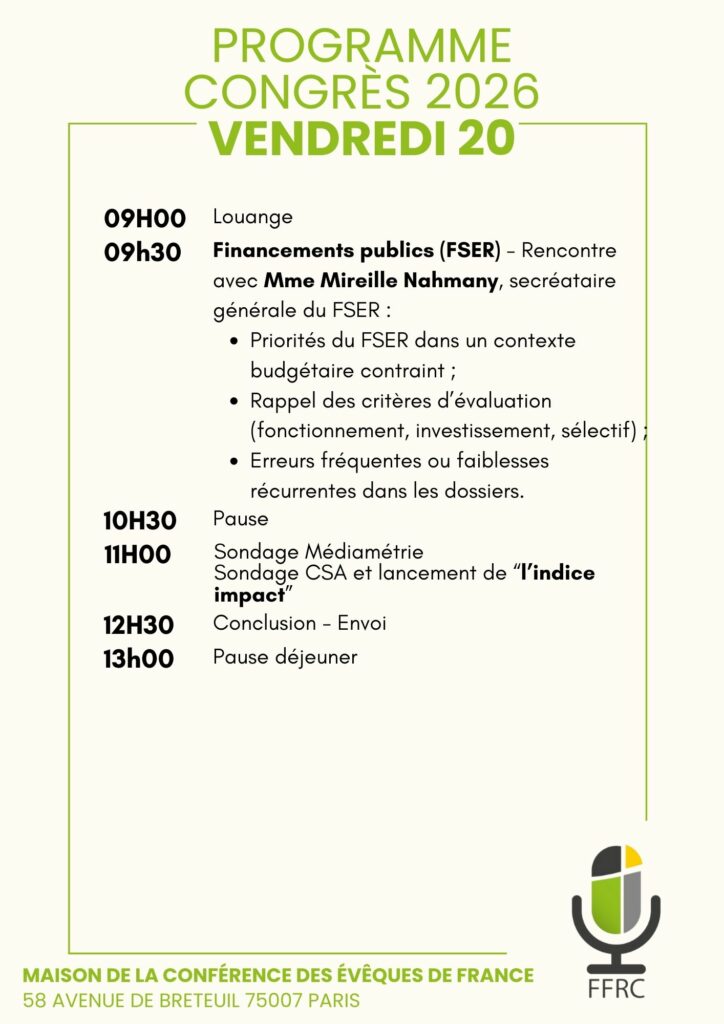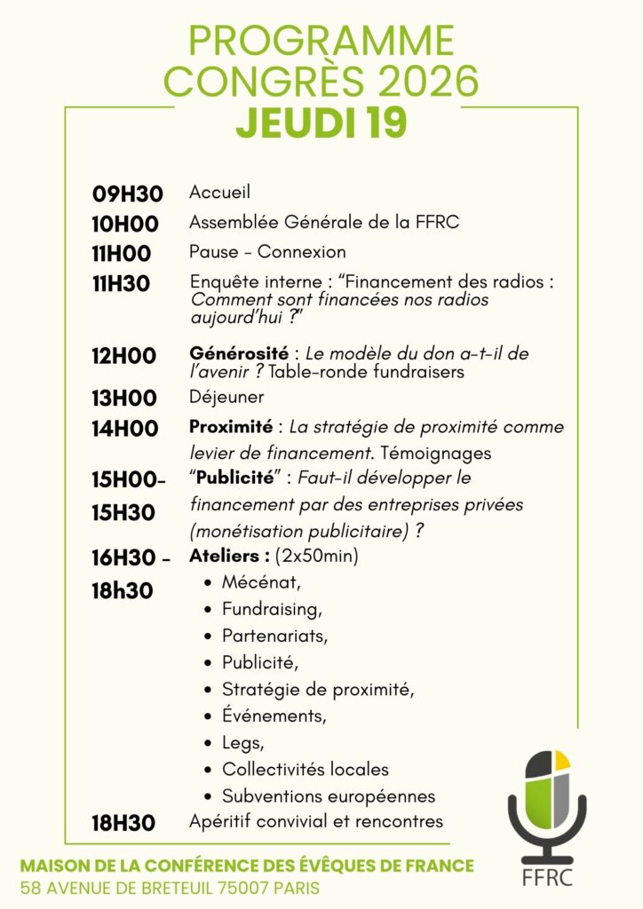 Financements publics (FSER), dons, mécénat, publicité, proximité, ateliers pratiques, rencontres et partage d’expériences : le Congrès FFRC est le rendez-vous indispensable pour renforcer nos modèles économiques, mutualiser nos solutions et défendre ensemble la place des radios chrétiennes associatives.